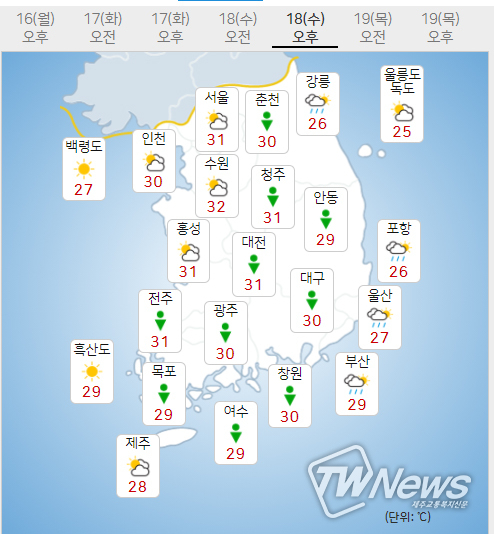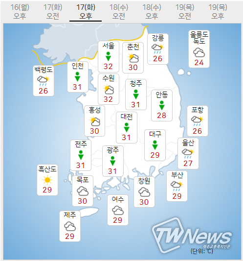 [제주교통복지신문 최효열 기자] 기상청은 화요일인 17일 낮최고기온 서울32도, 수원32도, 대전31도, 광주31도, 여수29도, 강릉26도, 대구29도, 부산29도, 제주도29도를 기록하겠다고 날씨예보했다.