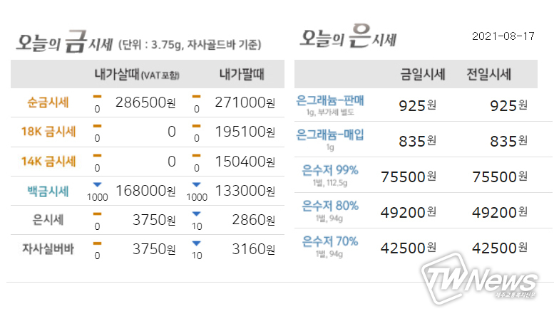 8월17일 0시 기준, 한국표준금거래소에 따르면 순금 1돈(Gold24k-3.75)은 28만 6,500원에 구입 가능하다. 어제와 같다.