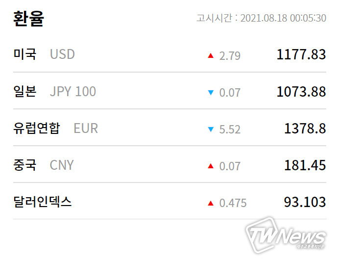 미국 1달러USD 환율은 어제보다 2.79 오른 1,177.83 원이다.