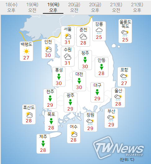 [제주교통복지신문 최효열 기자] 기상청은 목요일인 19일 대전,충청권,대구부산,경상도와 광주,전라도, 제주도지역에 비소식이 있으며 낮최고기온은 서울 31도, 수원31도, 대전30도, 광주29도, 여수28도, 강릉25도, 대구29도, 부산29도, 제주도28도를 기록하겠다고 날씨예보했다.