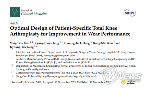 [제주교통복지신문 임의순 기자] 연세사랑병원이 미국식 ‘개인 맞춤형 인공관절’보다 국내서 개발한 ‘3D 개인 맞춤형 인공관절’의 마모가 적다는 결과를 세계적 학술지 ‘Journal of Clinical Medicine’에 발표했다고 19일 밝혔다.