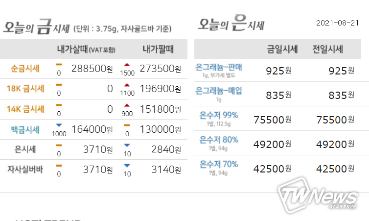 8월21일 0시 기준, 한국표준금거래소에 따르면 순금 1돈(Gold24k-3.75)은 28만 8,500원에 구입 가능하다. 어제와 같다.