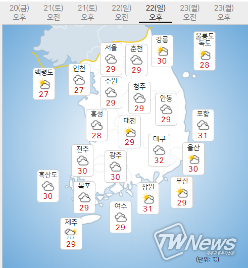 내일(22일) 아침 기온은 오늘(20일, 19.1~25.4도)과 비슷하거나 조금 낮아 전국이 20~24도가 되겠다.