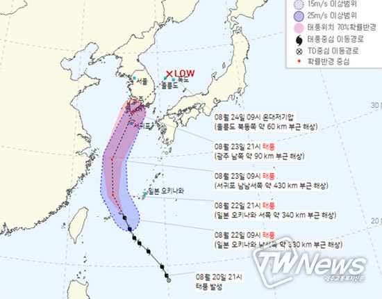 또 태풍은 계속 북서진해 23일 오후에 제주도 부근을 지나 밤에는 남해안으로 상륙할 것으로 보인다.