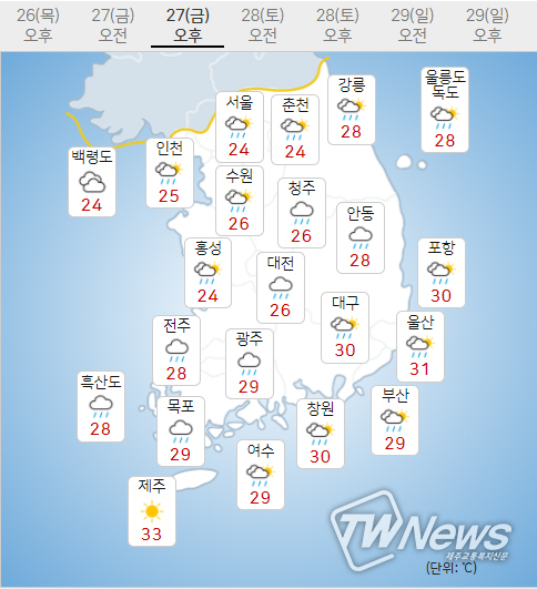 (주말전망) 28일(토)은 구름많고 비가 오겠고, 29일(일)은 구름많겠다. 아침 기온은 21~25도, 낮 기온은 29~33도가 되겠다.