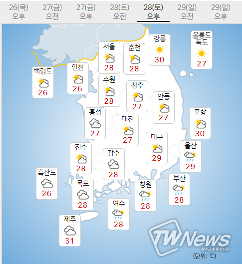 (주말전망) 28일(토)~29일(일)은 구름많겠으며, 아침기온은 25~26도, 낮기온은 29~31도가 되겠다.