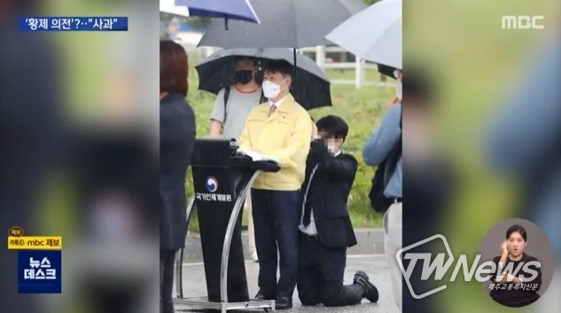 [제주교통복지신문 최효열 기자] 강성국 법무부 차관이 27일 아프가니스탄 특별입국자 지원방안 등을 브리핑할 당시 바닥에 무릎을 꿇은 채 우산을 씌워주는 직원을 놓고 과잉 의전 지적이 일고 있다.