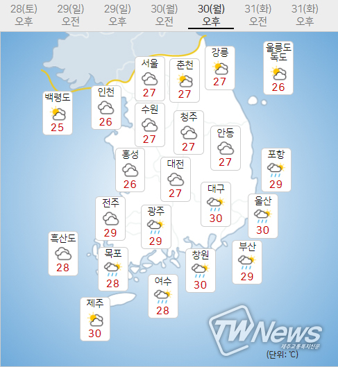 (주말전망) 28일(토)~29일(일)은 구름많겠으며, 아침기온은 25~26도, 낮기온은 29~31도가 되겠다.