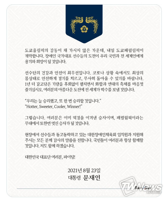 또 탁구 여자 단식 정영아 선수에게는 "2020 도쿄패럴림픽 동메달 획득을 축하한다. 런던과 리우에 이은 세 개 대회 연속 메달의 영광"이라며 "정 선수의 집념과 열정에 박수를 보내며 앞으로의 도전도 국민과 함께 응원하겠다"고 밝혔다.