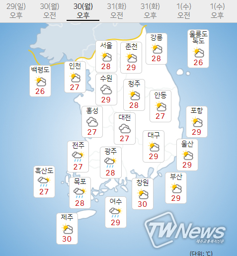 (30일) 아침최저기온은 서울 21도, 인천 21도, 수원 21도 등 18~22도, 낮최고기온은 서울 28도, 인천 27도, 수원 29도 등 27~30도가 되겠다.