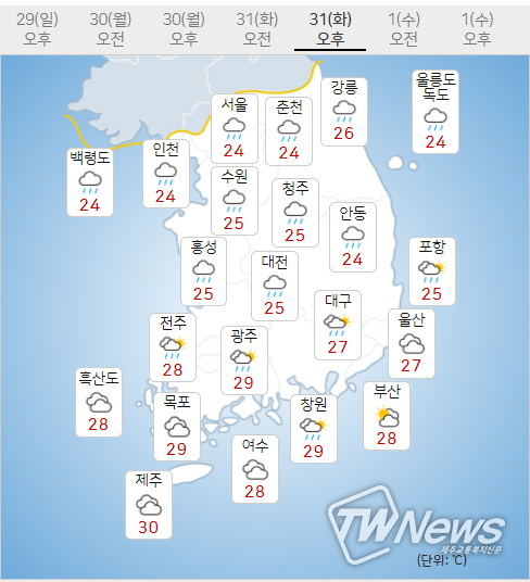 (31일) 아침최저기온은 서울 22도, 인천 22도, 수원 21도 등 18~22도, 낮최고기온은 서울 24도, 인천 24도, 수원 25도 등 22~26도가 되겠다.