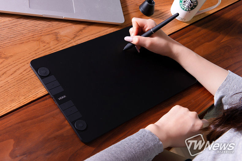VK 1060 PRO는 무충전펜을 사용해 작업 전후와 작업 중 불편을 최소화했다. 8192레벨 필압으로 시장 트렌드에 충실했고, 제품만의 특징으로 좌측 상·하단에 장착된 휠 버튼은 단축키와 함께 다양한 작업이 가능하다.