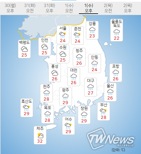 [제주교통복지신문 최효열 기자] 기상청은 8월의 마지막날인 31일 제주도를 제외한 전국에 비소식이 있으며 대전과 충청권을 중심으로 250mm이상의 많은비가 내리겠다고 날씨예보했다.