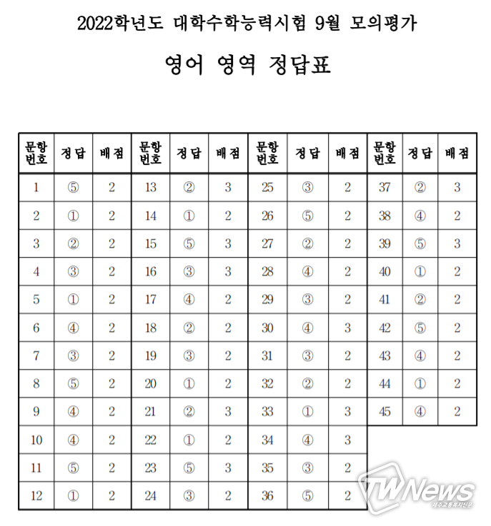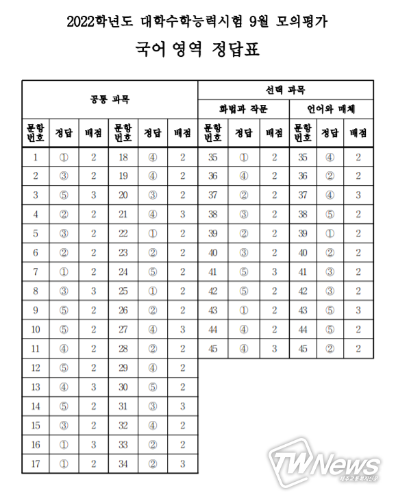한편 이번 9월 모의평가에서는 EBS 간접 연계율 50% 방침을 고려하여 문학에서는 현대시 ‘종가’, 고전 소설 ‘배비장전’, 고전 시가 ‘규원가’가 연계되어 출제됐다. 독서에서는 ‘미술사 독서’(1~3), ‘광고의 효과’(4~9), ‘반자유주의 논증’(10~13)이 연계됐다.