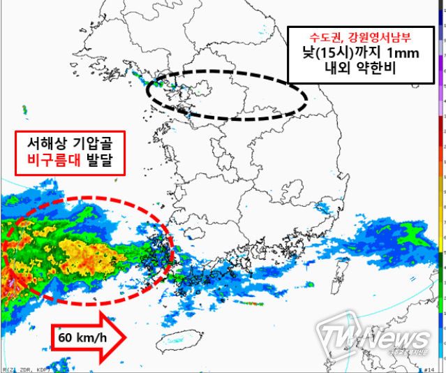 한편, 서해중부앞바다에 위치한 약한 기압골의 영향으로 수도권과 강원영서남부에는 오늘 낮(15시 전후)까지 1mm 내외의 약한 비가 내리거나 빗방울이 떨어지는 곳이 있겠다.