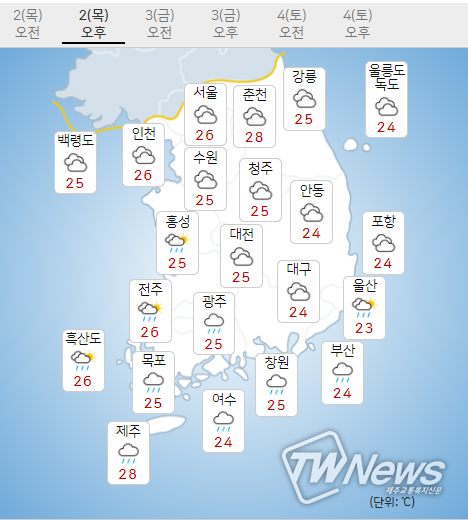다음은 목요일 2일 오늘의날씨와 내일주말날씨이다.