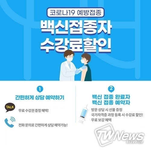 또한 백신 접종을 예약한 백신 접종 예약자에게도 같은 혜택이 적용된다. 방문 상담 시 접종 사실을 확인할 수 있는 코로나19 예방접종 증명서, 접종 예약 확인 문자를 제시하는 경우 수강료 할인 혜택이 제공된다.