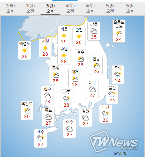 (3일) 아침최저기온은 서울 20도, 인천 20도, 수원 19도 등 15~21도, 낮최고기온은 서울 29도, 인천 28도, 수원 28도 등 27~29도가 되겠다.