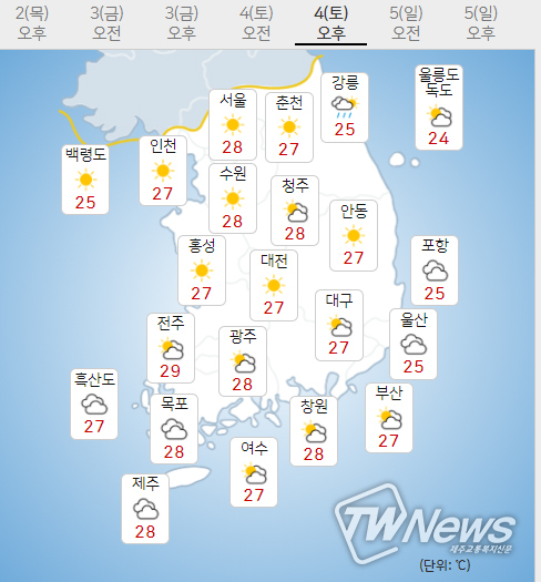 (4일) 아침최저기온은 서울 18도, 인천 19도, 수원 18도 등 14~20도, 낮최고기온은 서울 28도, 인천 27도, 수원 28도 등 26~28도가 되겠다.