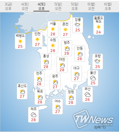 (4일) 아침최저기온은 서울 18도, 인천 19도, 수원 18도 등 14~20도, 낮최고기온은 서울 28도, 인천 27도, 수원 28도 등 26~29도가 되겠다.