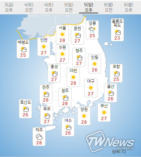 (5일) 아침최저기온은 서울 19도, 인천 20도, 수원 19도 등 15~21도, 낮최고기온은 서울 28도, 인천 27도, 수원 27도 등 26~29도가 되겠다.