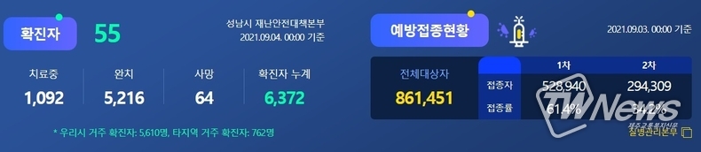 성남시에 따르면 4일 0시 기준 수정구 14, 중원구 9, 분당구 27, 타지역 5명 등 55명이 코로나 확진 판정을 받았다.