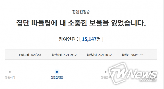 지난 2일 청와대 국민청원 게시판에 ‘집단 따돌림에 내 소중한 보물을 잃었습니다’라는 제목의 청원이 올라왔다. 청원인은 지난달 31일 오전 7시20분쯤 대구 북구 동변동의 한 아파트 10층에서 스스로 몸을 던진 고1의 어머니라고 자신을 소개했다.
