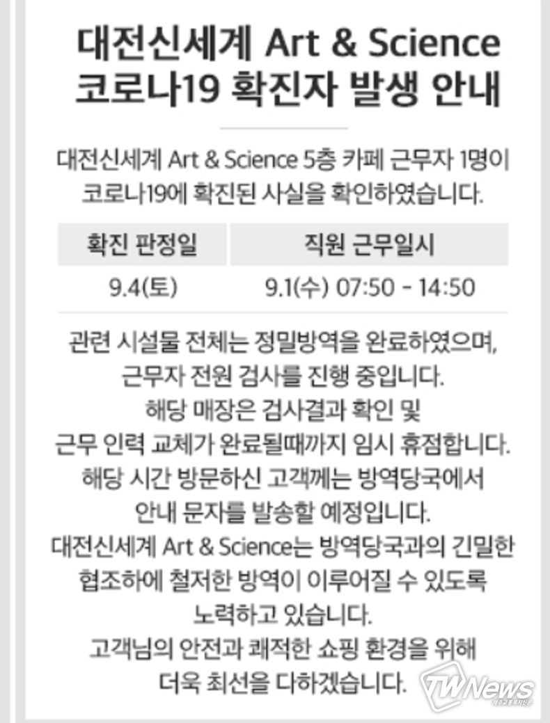 대전 신세계 Art & Science측은 5층 카페 근무자 1명이 코로나19에 확진판정을 받은 사실을 지난 4일 토요일에 받았다고 전했다.