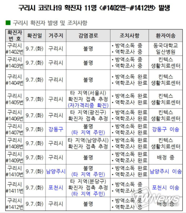 7일 구리시에 따르면 신규 확진자는 11명이다.