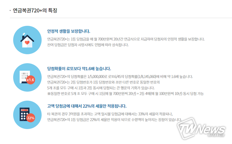 연금복권 720 1등 당첨금은 매달 700만 원씩 20년간 연금 형식으로 지급된다. 세금을 뗀 실수령액은 월 546만 원 정도다.