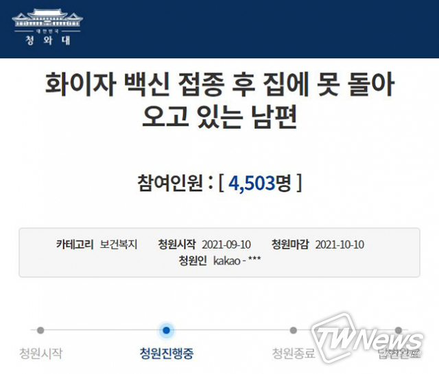 [제주교통복지신문 최효열 기자] 건강하던 40대 남편이 화이자사(社)의 신종 코로나바이러스 감염증(코로나19) 백신 접종 후 ‘뇌경색’ 진단을 받고 중환자실에 입원해 있다는 아내의 청원이 등장했다.