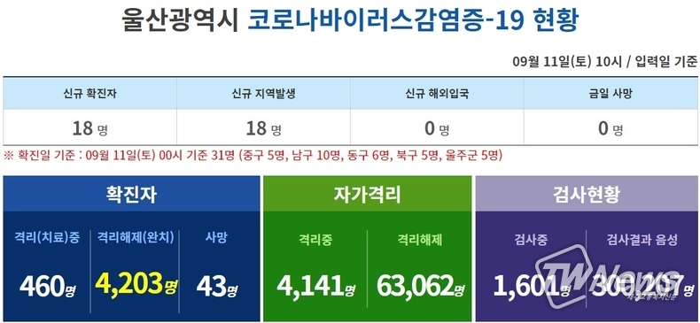 11일 0시 기준 울산광역시에 따르면 중구5, 남구10, 동구6, 북구5, 울주군5명 등 31명이 코로나 확진 판정을 받았다.