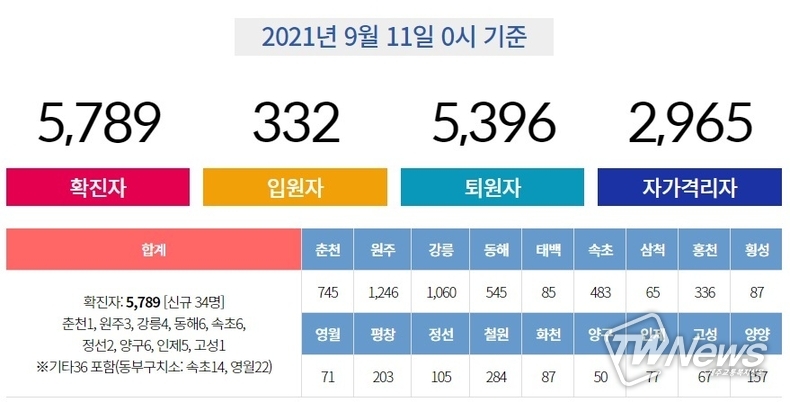강원도에 따르면 10일 동해6, 속초6, 양구6, 인제5, 강릉4, 원주3, 정선2, 춘천1, 고성1명 등 34명이 코로나 확진 판정을 받았다.