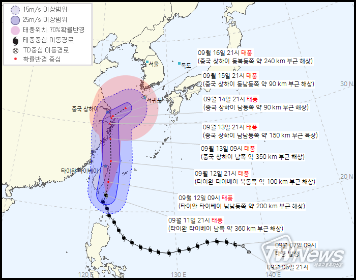 16일 21시 중국 상하이 동북동족 약240km부근해상