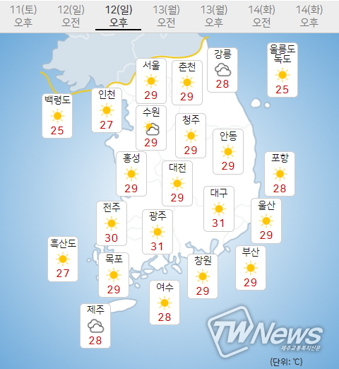 (12일) 아침최저기온은 서울 21도, 인천 21도, 수원 20도 등 17~21도, 낮최고기온은 서울 29도, 인천 27도, 수원 29도 등 27~30도가 되겠다.