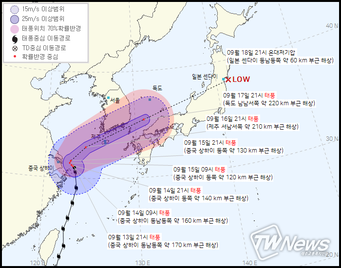 18일 21시 일본 센다이 동남동쪽 약 60km부근해상에서 온대저기압으로 약화된다.
