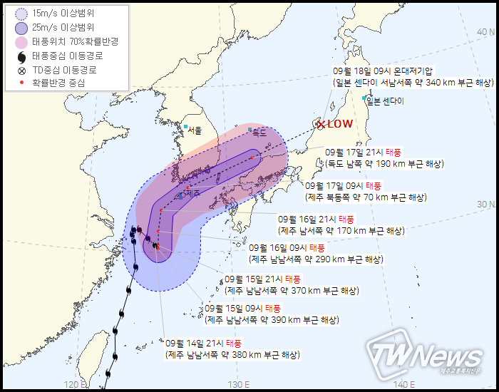18일 09시 일본 센다이 서남서쪽 약 340km부근해상에서 온대저기압으로 약화될 예정이다.