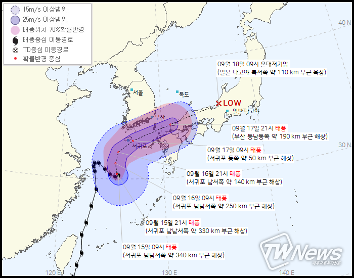 16일 09시 제주도 서귀포 남남서쪽 약 250km부근해상