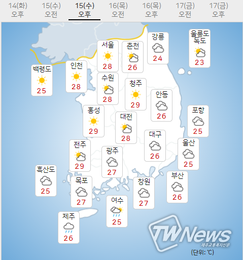다음은 15일 수요일 오늘날씨와 16일 목요일 내일날씨이다.