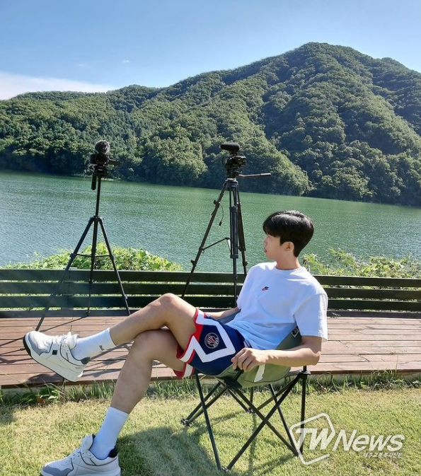 사진 속 임영웅은 티셔츠와 반바지, 운동화 등 편안한 차림으로 의자에 앉아 다리를 꼬고 있다.