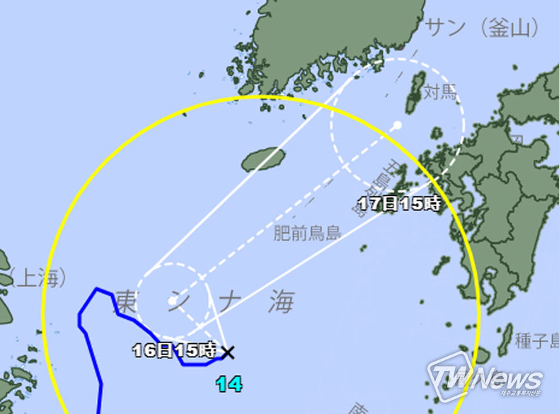 16일 15시 제주도 서귀포 남남서쪽 약 250km부근해상