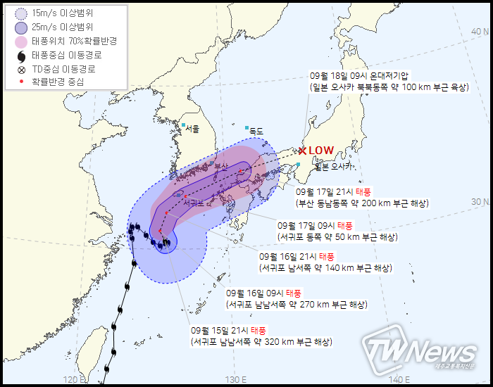 특히, 태풍의 북상에 따라 최근접 시점인 모레(17일) 새벽부터 낮 사이 전남남해안에는 강한 바람과 함께 많은 비가 내리는 곳이 있겠다.