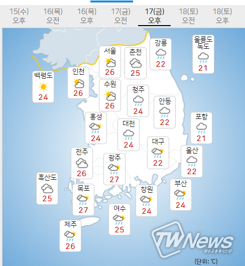 (17일) 아침최저기온은 서울 19도, 인천 20도, 수원 20도 등 15~21도, 낮최고기온은 서울 26도, 인천 26도, 수원 26도 등 22~28도가 되겠다.