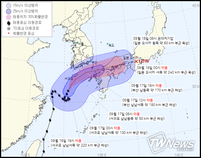 18일 06시 일본 오사카 동쪽 약 60km부근육상에서 온대저기압으로 약화될예정이다.