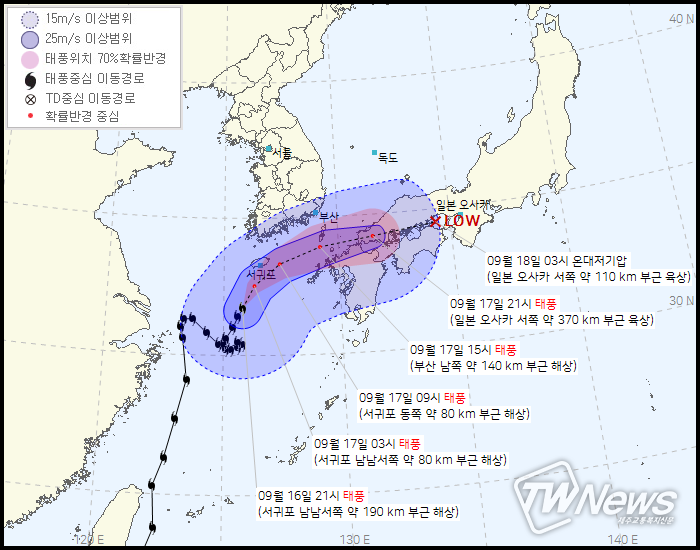 18일 03시 일본 오사카 서쪽 약 110km부근육상에서 온대저기압으로 약화될 예정이다.