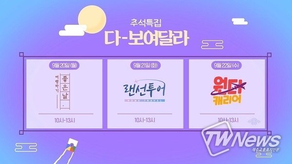 폴라리스TV는 추석 연휴기간인 오는 20일, 21일, 22일 오전 10시부터 오후 1시까지 자체 제작 프로그램 ‘여행하기 좋은날’, ‘랜선투어’, ‘원더캐리어’를방영한다. 4시간 연속방송으로 준비한 이번 특별 편성은 폴라리스TV의 랜선 여행 프로그램들로 구성돼 그간 여행을 떠나지 못한 시청자들에게 대리 만족을 선사하며 즐거움으로 가득한 추석 연휴를 선사할 계획이다.