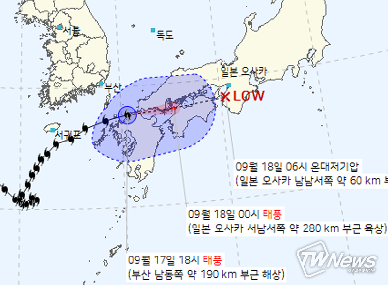 18일 06시 일본 오사카 남남서쪽 약60km부근육상에서 온대저기압으로 약화될 예정이다.