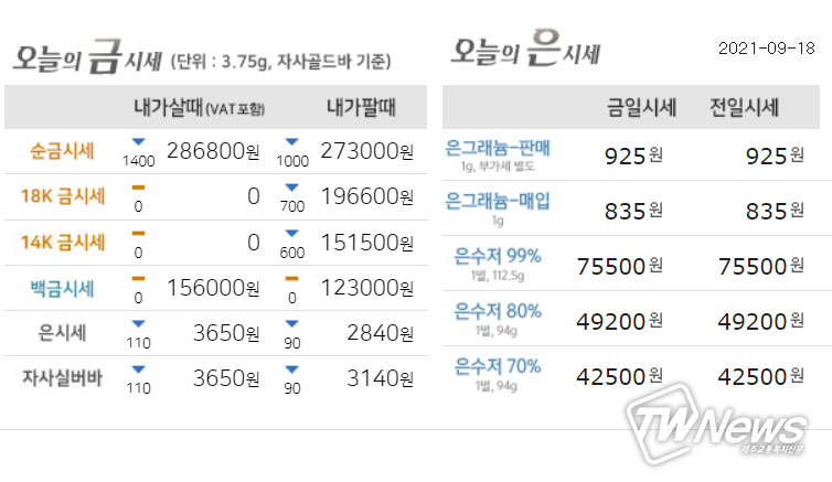 은(Silver-3.75g)은 3,750원에 구입할 수 있으며, 팔때는 2,840원에 거래 가능하다.