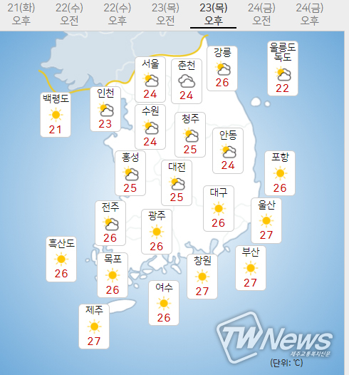 (23일)까지 대체로 맑겠으며 기온은 (21일, 아침최저기온 21~22도, 낮최고기온 26~29도)과 비슷하겠다.
