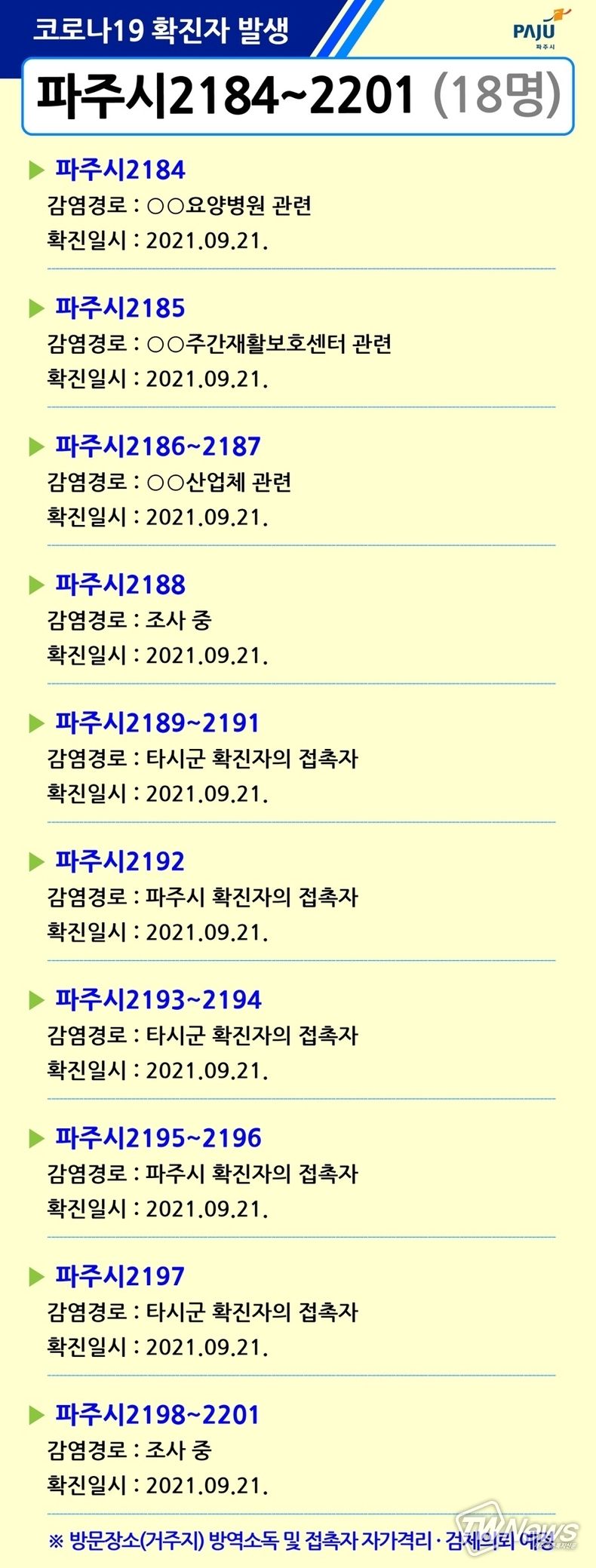 파주시는 22일 안전 안내 문자를 통해 "9월 22일 0시 기준 확진자 18명 발생(2184~2201번). 홈페이지 및 블로그 참조바랍니다."라고 밝혔다.